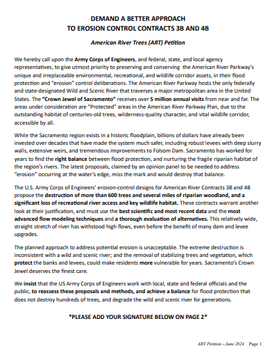 American River Trees (ART) is working with our legal team regarding the unnecessarily destructive components and non‑compliant CEQA elements of the Army Corps’ American River erosion project, Contract 3B.